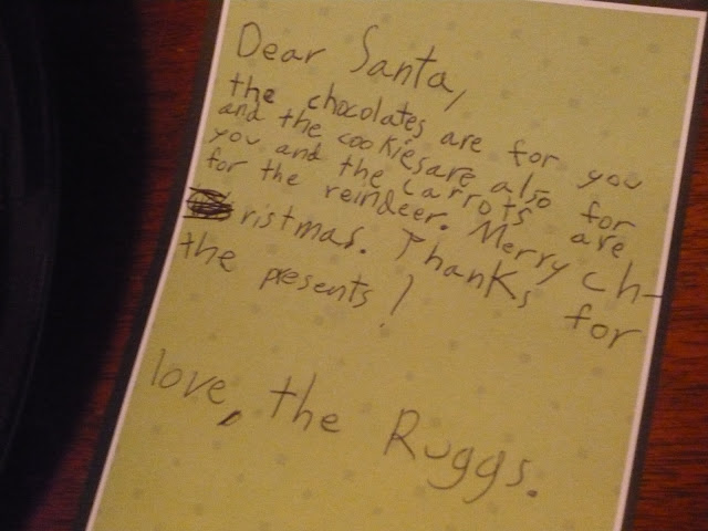 How sweet! My kids left a note very similar to that one year and Santa wrote back that Rudolph couldn't "eat the carrots because they give him diarrhea and that always makes for a messy ride." Perhaps Rudolph has gotten over his little carrot intolerance over the years. :)